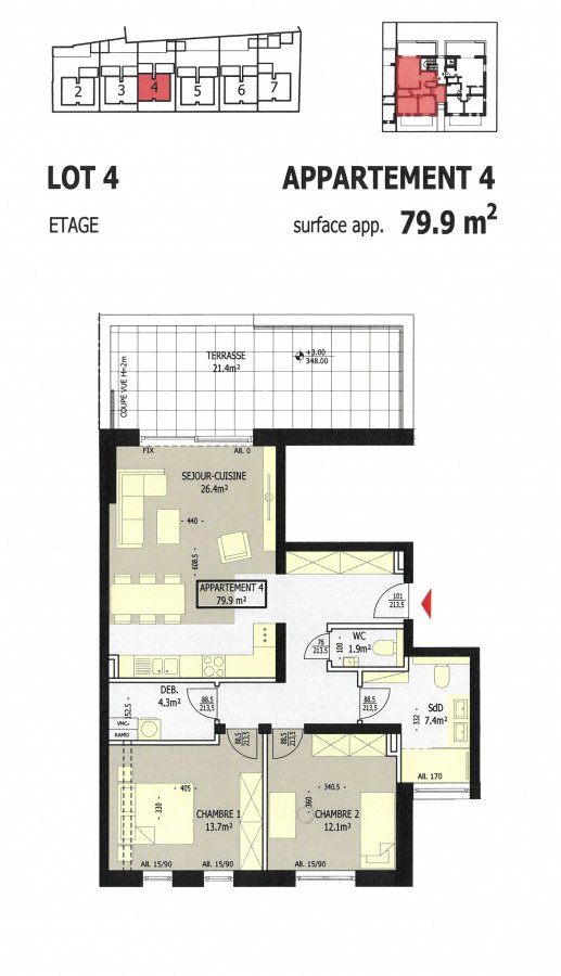 Nouvelle construction de plusieurs résidences avec appartement de 1-2 chambres à vendre dans le village de Grosbous.L'Immobilière de l'Attert vous propose l'appartement nr 4 (Lot 4) d'une surface utile de +/- 79,90 m² situé au 1er étage :