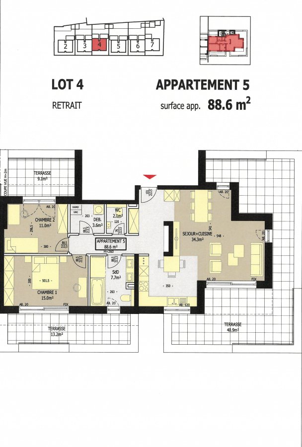 Nouvelle construction de plusieurs résidences avec appartement de 1-2 chambres à vendre dans le village de Grosbous.L'Immobilière de l'Attert vous propose l'appartement nr 5 (Lot 4) d'une surface utile de +/- 88,60 m² situé au 2ème étage :