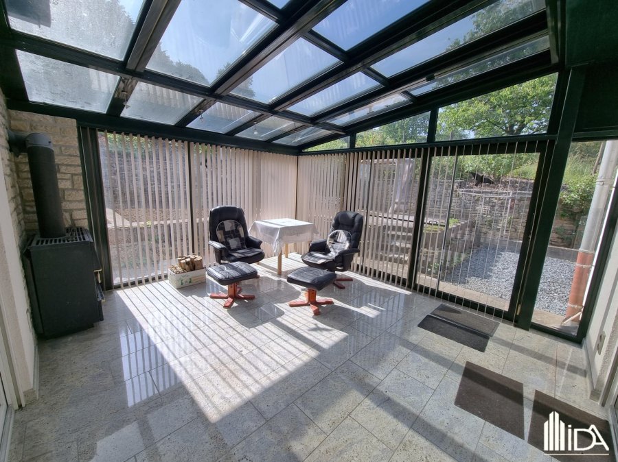 - Véranda avec poêle à bois équipé d'un toit ouvrant avec marquise électrique